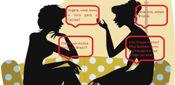 Avete notato che nella domanda “Ângela, você levou o livro para o Carlos?” il riferimento geografico si trova ormai lontano dalle due amiche? Angela è andata da Carlo (foi à casa do Carlos), quindi gli ha portato il libro (levou-lhe o livro). Nella seconda domanda “ele trouxe muitos livros do Brasil?”, è chiaro che Carlo è tornato dal Brasile e ha portato con sé tanti libri (trouxe tantos/muitos livros), ma ne ha anche portati tanti all’amica Luciana, quando ci è andato (levou muitos para a amiga Luciana).