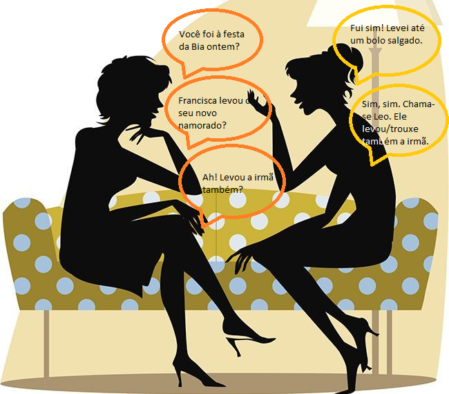 3 – Nel terzo esempio le due amiche stanno parlando di una festa alla quale soltanto una di loro ci è andata. Credo che sia tutto chiaro, tranne che per la risposta “Sim, sim. Chama-se Leo. Ele levou/trouxe a irmã também”. Cerchiamo di ragionare: lei è andata alla festa e racconta all’amica che Leo ha portato la sorella (levou), però, nel fare riferimento a questo fatto, può adoperare ambedue i verbi, cioè: “levar” nel senso che Leo è uscito di casa con la sorella, e “trazer“, nel senso che lui è arrivato alla festa con la sorella. Nella prima affermazione il narratore si esclude della scena, nella seconda, invece, s’include, cioè si rende partecipe.